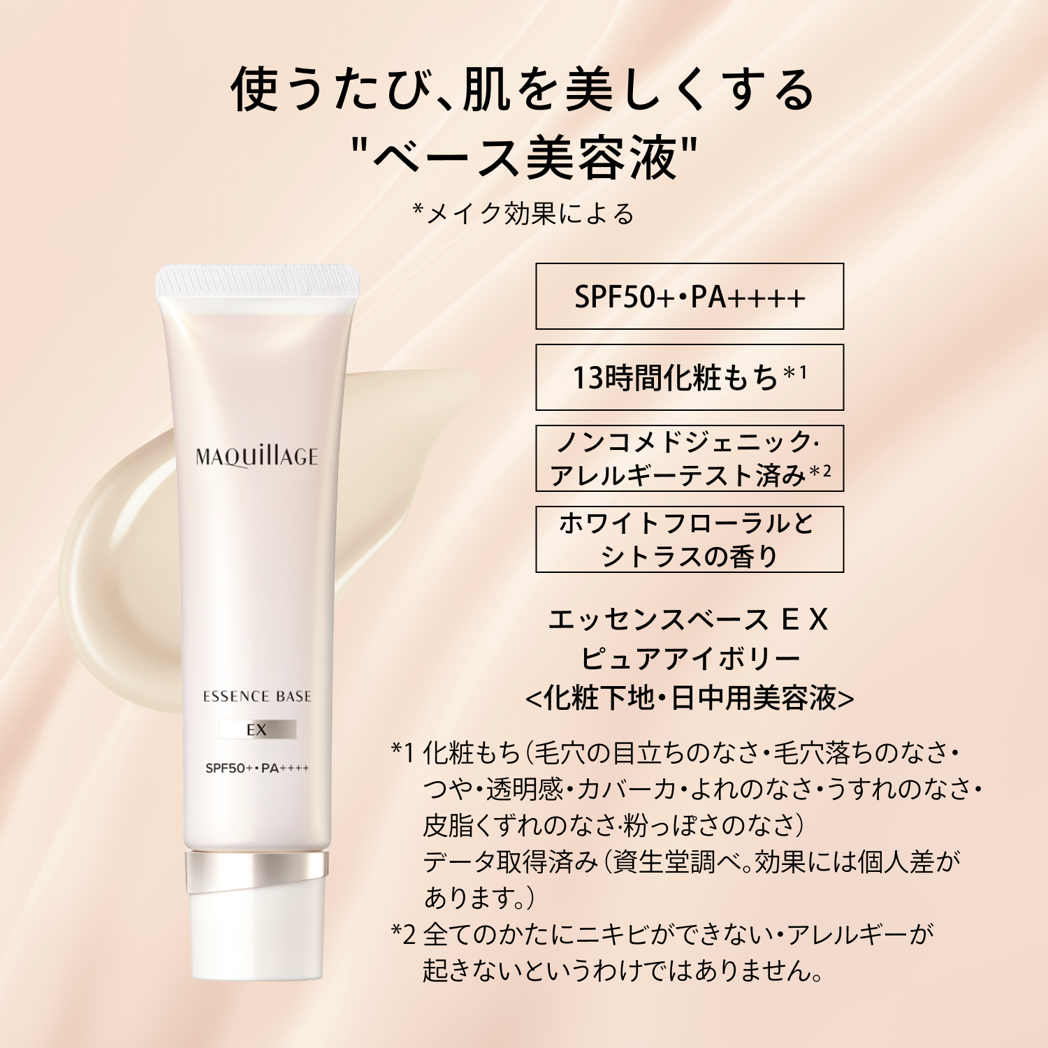 ◇目に入らないよう注意し、入ったときはすぐに洗い流してください。 ◇ご使用後はチューブ容器の口もとをきれいに拭き、必ずキャップをきちんと閉めてください。 ◇衣服についた場合は、すぐに洗剤でていねいに洗ってください。洗う際には、ピンクに変色しますので塩素系漂白剤のご使用はさけてください。 ◇日のあたるところや高温のところに置かないでください。 ◇乳幼児の手の届かないところに置いてください。 ◇製品性質上、まれに透明の液体(エモリエント成分)が出ることがありますが、使用性や仕上がりに問題はありません。 ※商品のSPF表示及びPA表示は、SPF試験法に定められている塗布量1c㎡あたり2mgを皮ふに塗布して測定した結果です。