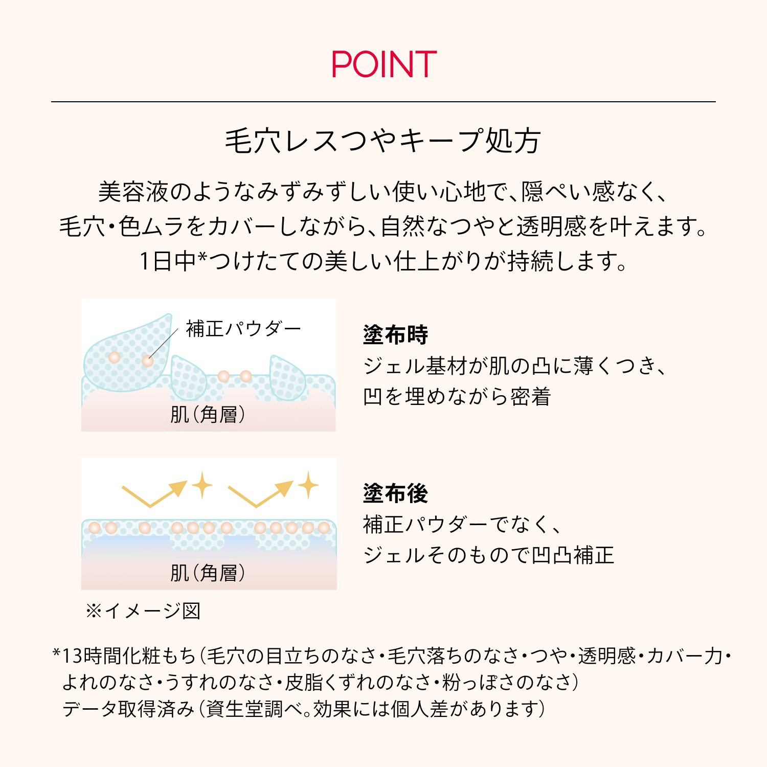 ●スキンケアなどで肌を整えた後、手のひらにパール粒1コ分を目安にとり、顔全体になじませます。 ●使用量が少ないと、十分な紫外線防御効果が得られません。