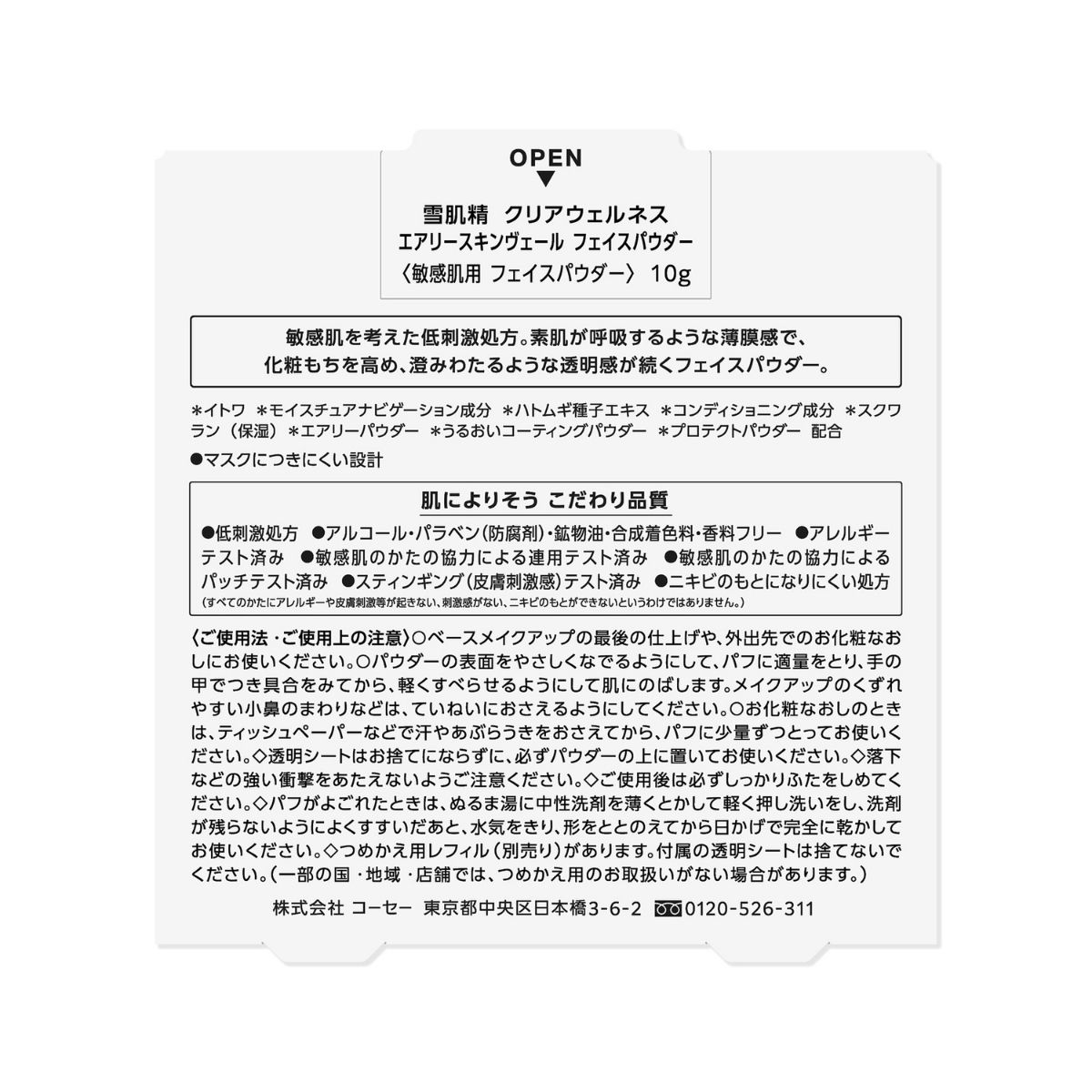 透明シートはお捨てにならずに、必ずパウダーの上に置いてお使いください。落下などの強い衝撃をあたえないようご注意ください。ご使用後は必ずしっかりふたをしめてください。パフがよごれたときは、ぬるま湯に中性洗剤を薄くとかして軽く押し洗いをし、洗剤が残らないようによくすすいだあと、水気をきり、形をととのえてから日かげで完全に乾かしてお使いください。つめかえ用レフィル (別売り) があります。付属の透明シートは捨てないでください。 (一部の国・地域・店舗では、つめかえ用のお取扱いがない場合があります。)