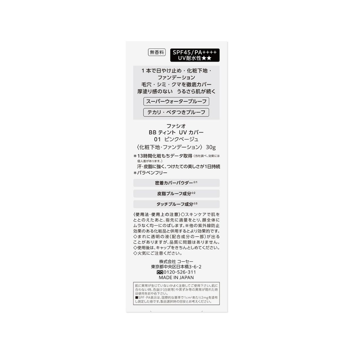 ファシオ BB ティント UV カバー 01 ピンクベージュ (化粧下地・ファンデーション) 30g : 1日耐久 (当社調べ。効果には個人差があります。) カバーBBティント。ピンクベージュ 01。スーパーウォータープルーフ。無香料。SPF45/PA++++。UV耐水性★★。1本で日やけ止め・化粧下地・ファンデーション。毛穴・シミ・クマを徹底カバー。厚塗り感のないうるさら肌が続く。スーパーウォータープルーフ。テカリ・ベタつきプルーフ。13時間化粧もちデータ取得 (当社調べ。効果には個人差があります。) 汗・皮脂に強く、つけたての美しさが1日持続。パラベンフリー。