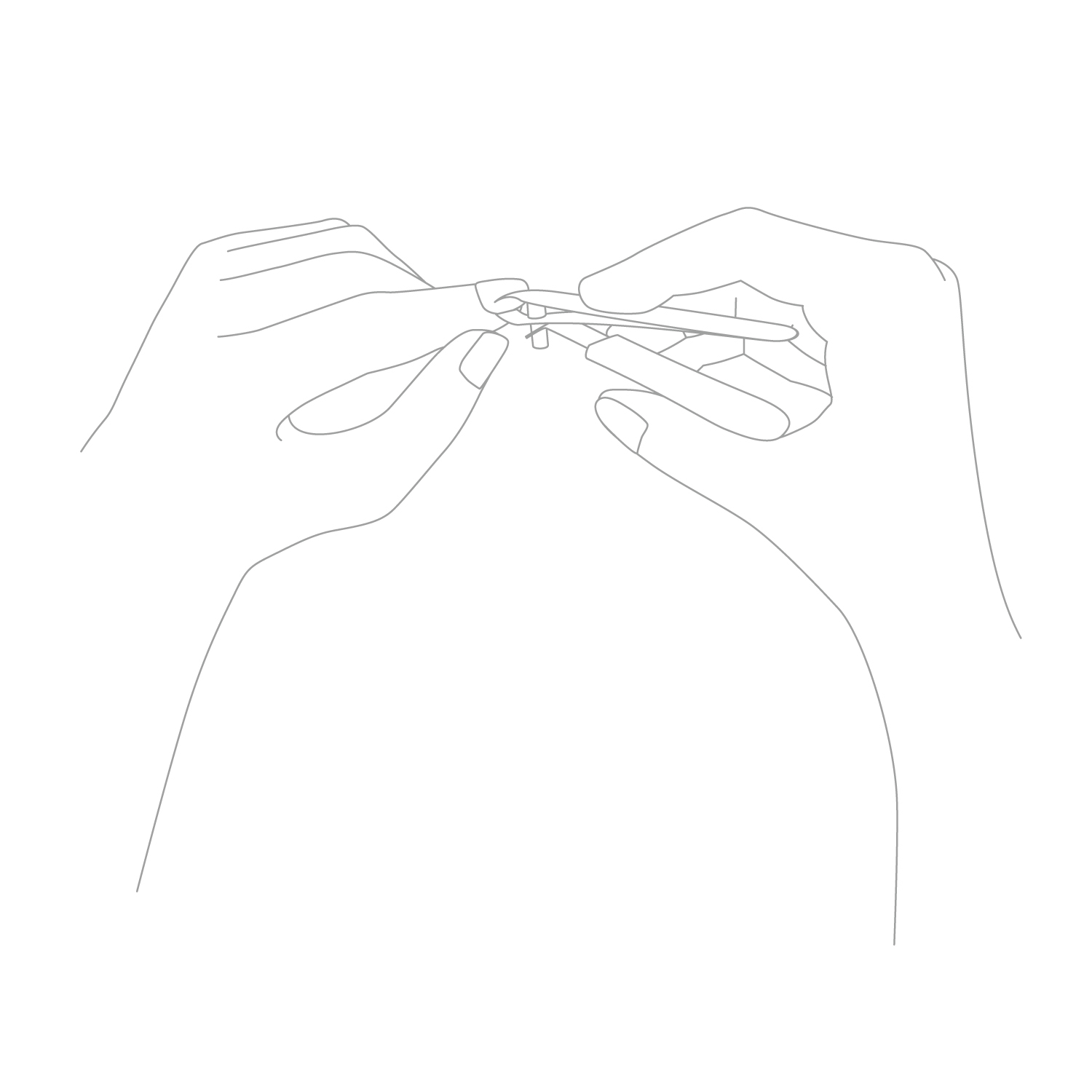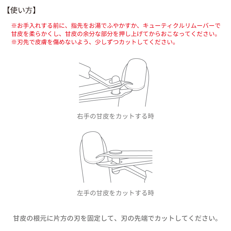 キューティクルプッシャーで甘皮の余分な部分を立ち上げたあと、カットしたい甘皮の根元に片方の刃を固定し、刃の先端で少しずつカットしていきます。刃先で皮膚を傷めないよう、少しずつカットしてください。