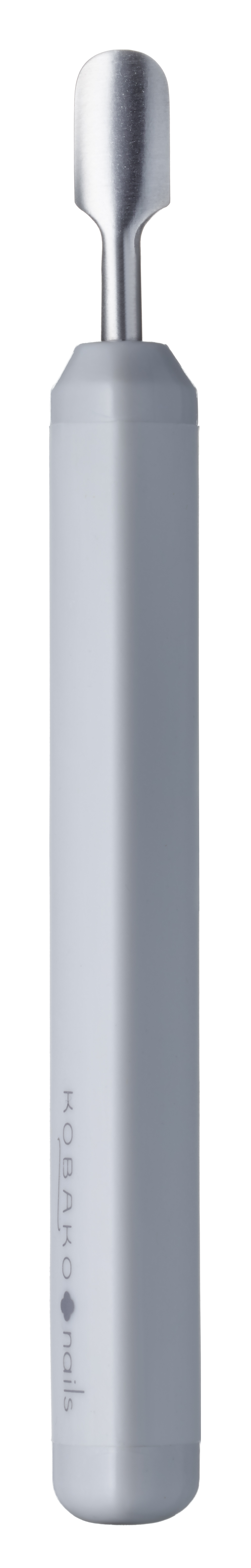 キューティクルリムーバーをつけたまま、キューティクルプッシャーで爪先から甘皮までまっすぐにすべらせるように、やさしくルースキューティクル(不要な角質)を押してください。爪表面に対しておよそ30度の角度に合わせて、爪表面のルースキューティクルをやさしく押し上げ、甘皮の輪郭を整えます。