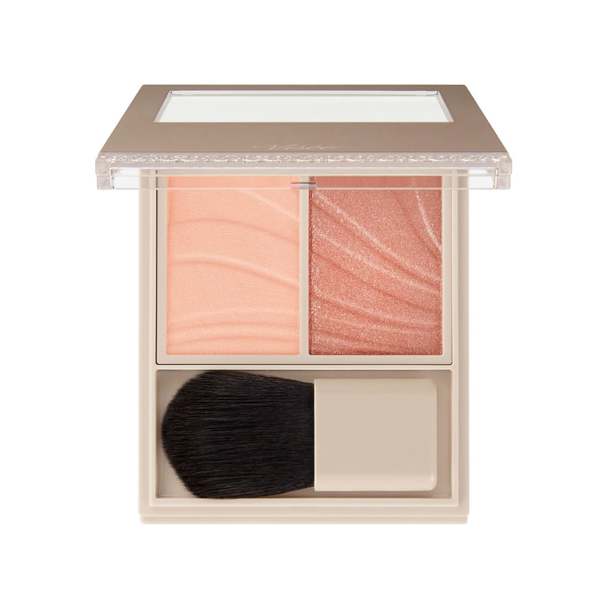 A、Bの順でお使いください。Aを指で頬全体にのせてから、Bをブラシに適量含ませ、手の甲で色のつき具合をみてから、血色感と立体感をあたえたい部分に重ねてください。Aはやわらかいスフレベースです。表面を一方向に軽くすべらせるようにやさしくおとりください。