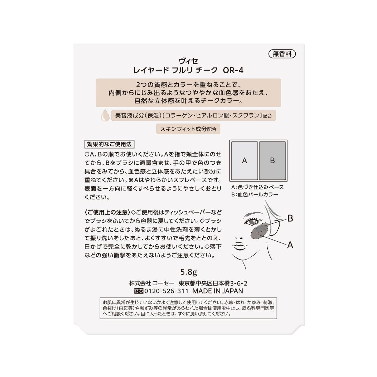 ヴィセ レイヤード フルリ チーク OR-4 5.8g : 重ねて咲かせる立体ツヤ。2つの質感 レイヤーチーク。OR-4 デイジーオレンジ。無香料。2つの質感とカラーを重ねることで、内側からにじみ出るようなつややかな血色感をあたえ、自然な立体感を叶えるチークカラー。美容液成分 (保湿) (コラーゲン・ヒアルロン酸・スクワラン) 配合。スキンフィット成分配合。