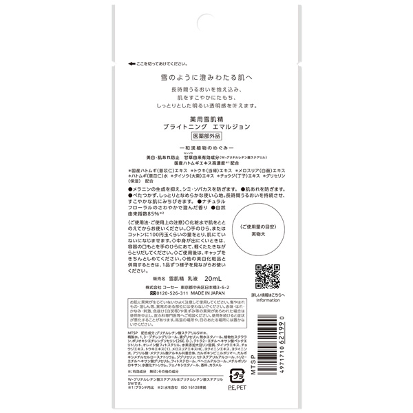 中身が出にくいときは、容器の口もとを手のひらにあて、軽くたたきながらとり出してください。ご使用後は、キャップをきちんとしめてください。他の美白化粧品と併用するときは、1品ずつ様子を見ながらお使いください。