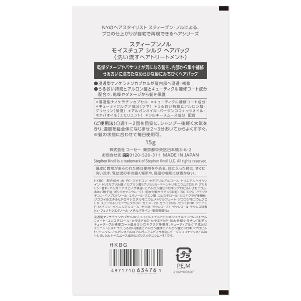 スティーブンノル モイスチュア シルク ヘアパック (洗い流すヘアトリートメント) 15g : 乾燥ダメージやパサつきが気になる髪を、内部から集中補修。うるおいに満ちたなめらかな髪にみちびくヘアパック。浸透型ナノケラチンカプセルが髪内部へ浸透・補修。うるおい持続ヒアルロン酸とキューティクル補修コート成分配合で、乾燥やダメージから髪を保護。浸透型ナノケラチンカプセル、キューティクル補修コート成分、キューティクルケア成分 (ツヤ) 、うるおい持続ヒアルロン酸・グリセリン (保湿) 、アルガンオイル・バージンココナッツオイル・ホホバオイル (エモリエント) 、シルキースムース成分配合。