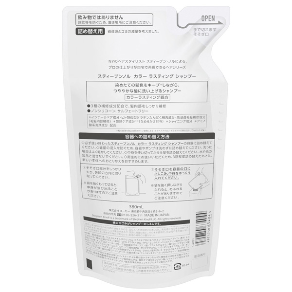 必ず使い終わったスティーブンノル カラーラスティング シャンプーの容器に詰め替えてください。雑菌の混入を防ぐため、容器やポンプは洗わずに詰め替えてください。洗った場合はよく乾かしてください。中身を使い切ってから全量を詰め替えてください。水や他の製品と混ぜないでください。衛生的にお使いいただくため、3回程度詰め替えたあとは、新しい本体へのおとりかえをおすすめします。飲み物ではありません。誤飲等を防ぐため、置き場所にご注意ください。