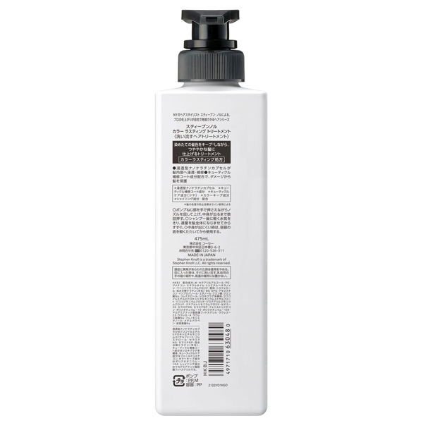 スティーブンノル カラー ラスティング トリートメント (洗い流すヘアトリートメント) 475mL : 染めたての髪色をキープ (髪の色落ち防止効果はライン使用による) しながら、つややかな髪に仕上げるトリートメント。カラーラスティング処方。浸透型ナノケラチンカプセルが髪内部へ浸透・補修。キューティクル補修コート成分配合で、ダメージから髪を保護。浸透型ナノケラチンカプセル、キューティクル補修コート成分、キューティクルケア成分 (ツヤ) 、カラーキープ成分、シャイニング成分配合。