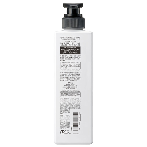 スティーブンノル スムース ストレート トリートメント (洗い流すヘアトリートメント) 475mL : くせ・うねりをおさえ、まとまりやすくまっすぐ整った髪に (ライン使用による) 仕上げるトリートメント。くせ・うねりケア処方。浸透型ナノケラチンカプセルが髪内部へ浸透・補修。キューティクル補修コート成分配合で、ダメージから髪を保護。浸透型ナノケラチンカプセル、キューティクル補修コート成分、キューティクルケア成分(ツヤ)、酸熱ケア成分 (毛髪コートし、ヘアアイロン・ドライヤーの熱を活かしてうねりをおさえた髪に仕上げる) (うねり抑制) 、ストレートアシスト成分 (仕上がり効果による) (毛髪コート) 配合。