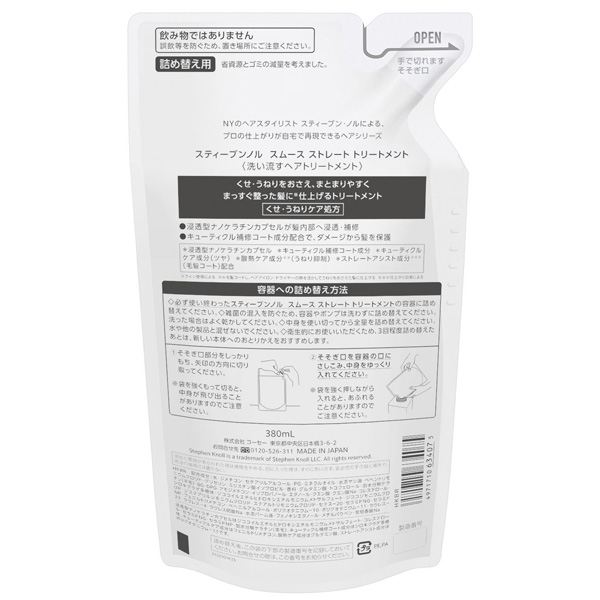 必ず使い終わったスティーブンノル スムース ストレート トリートメントの容器に詰め替えてください。雑菌の混入を防ぐため、容器やポンプは洗わずに詰め替えてください。洗った場合はよく乾かしてください。中身を使い切ってから全量を詰め替えてください。水や他の製品と混ぜないでください。衛生的にお使いいただくため、3回程度詰め替えたあとは、新しい本体へのおとりかえをおすすめします。飲み物ではありません。誤飲等を防ぐため、置き場所にご注意ください。