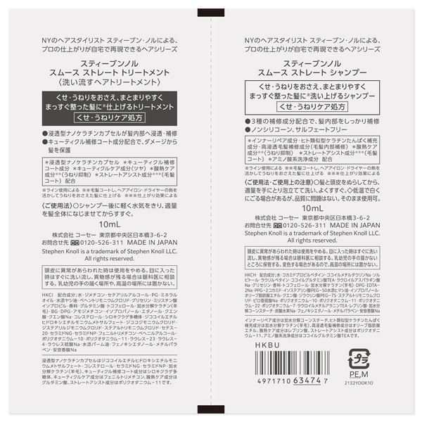 スティーブンノル スムース ストレート シャンプー : 髪と頭皮をぬらしてから、適量を手にとり泡立てて洗い、よくすすぐ。スティーブンノル スムース ストレート トリートメント : シャンプー後に軽く水気をきり、適量を髪全体になじませてからすすぐ。