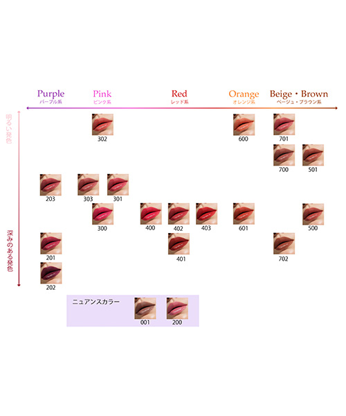 仕上がりは、唇につけてからのお楽しみ! 濃密・淡めなど、色ごとに発色が微細に異なります。