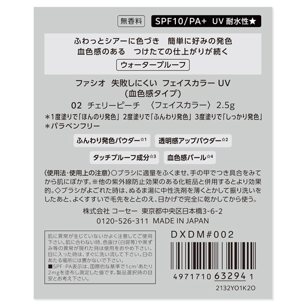 ファシオ 失敗しにくい フェイスカラー UV (血色感タイプ) (フェイスカラー) 2.5g : 02 チェリーピーチ。無香料。SPF10/PA+。UV耐水性★。ウォータープルーフ。ふわっとシアーに色づき、簡単に好みの発色。血色感のあるつけたての仕上がりが続く。1度塗りでほんのり発色。2度塗りでふんわり発色。3度塗りでしっかり発色。パラベンフリー。ふんわり発色パウダー。透明感アップパウダー。タッチプルーフ成分。血色感パール。