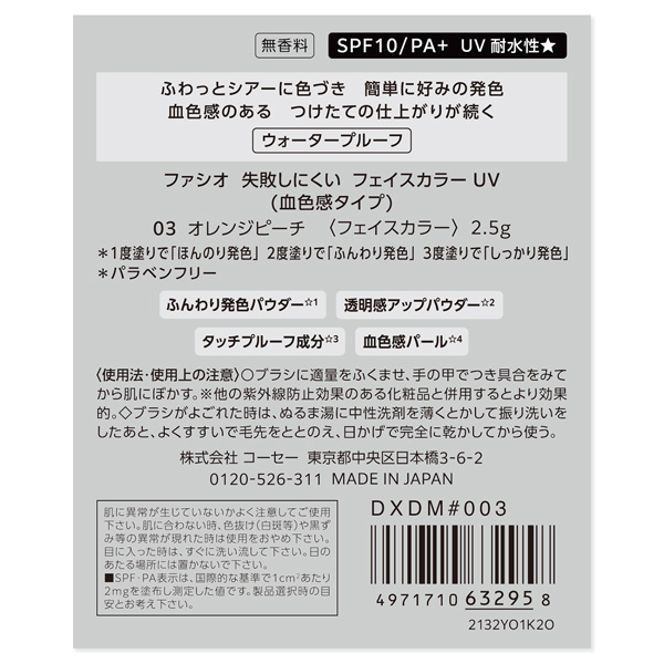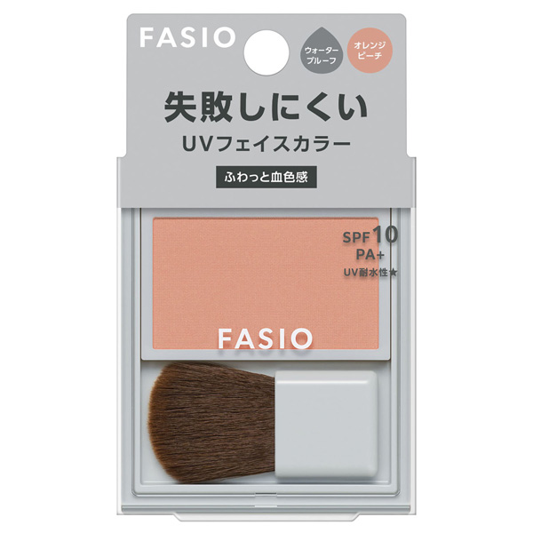 ファシオ 失敗しにくい フェイスカラー UV (血色感タイプ) (フェイスカラー) 2.5g : 03 オレンジピーチ。無香料。SPF10/PA+。UV耐水性★。ウォータープルーフ。ふわっとシアーに色づき、簡単に好みの発色。血色感のあるつけたての仕上がりが続く。1度塗りでほんのり発色。2度塗りでふんわり発色。3度塗りでしっかり発色。パラベンフリー。ふんわり発色パウダー。透明感アップパウダー。タッチプルーフ成分。血色感パール。